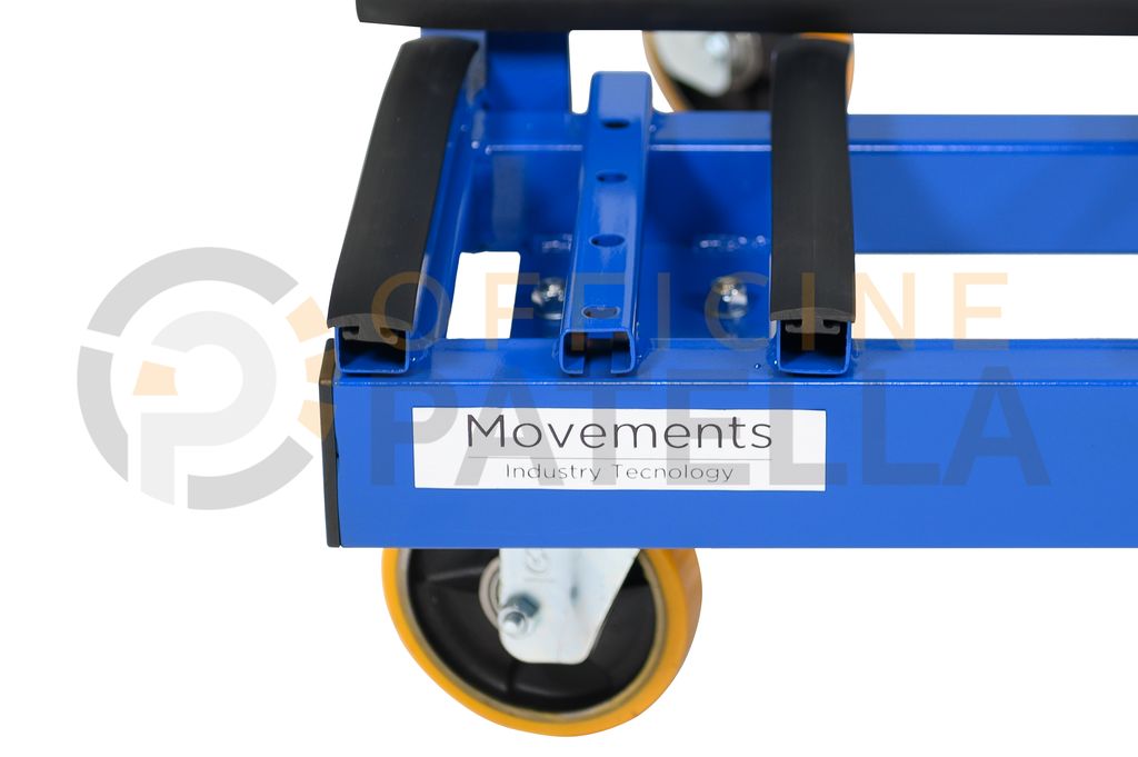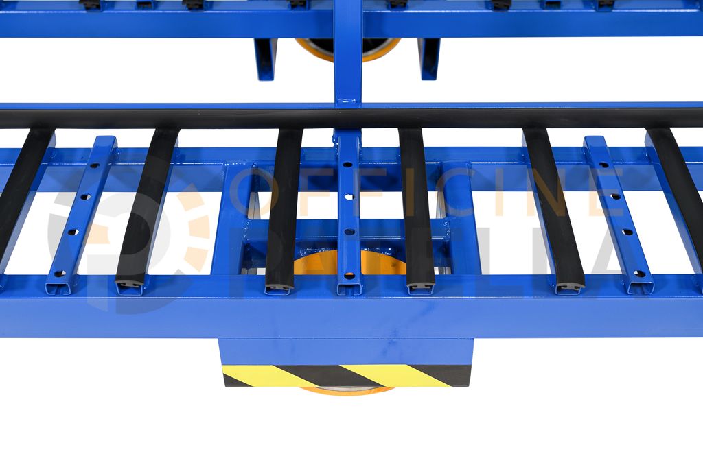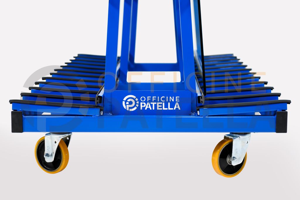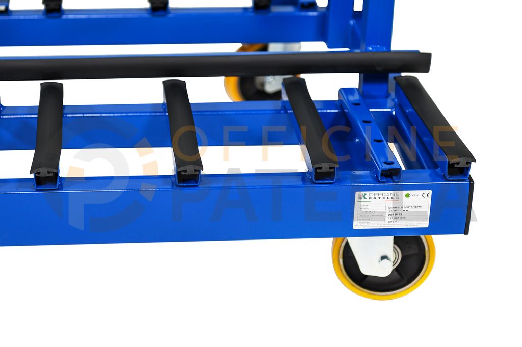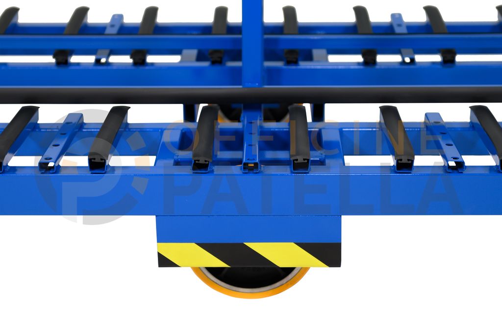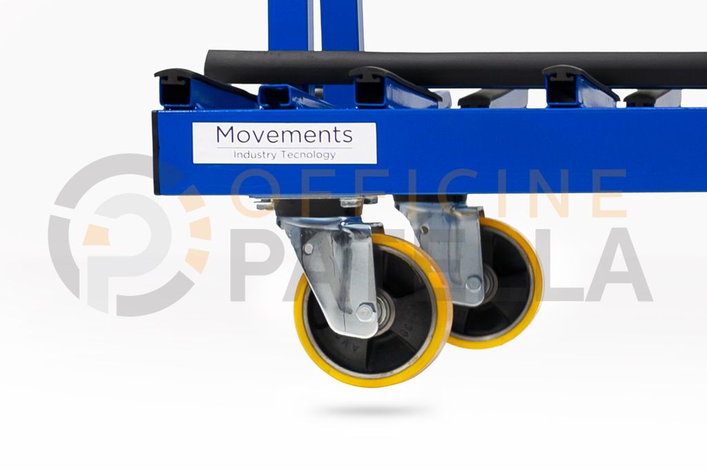 Dotato di 2 ruote centrali fisse diametro 250 mm. + 4 ruote girevoli diametro 150 mm. imbullonate.