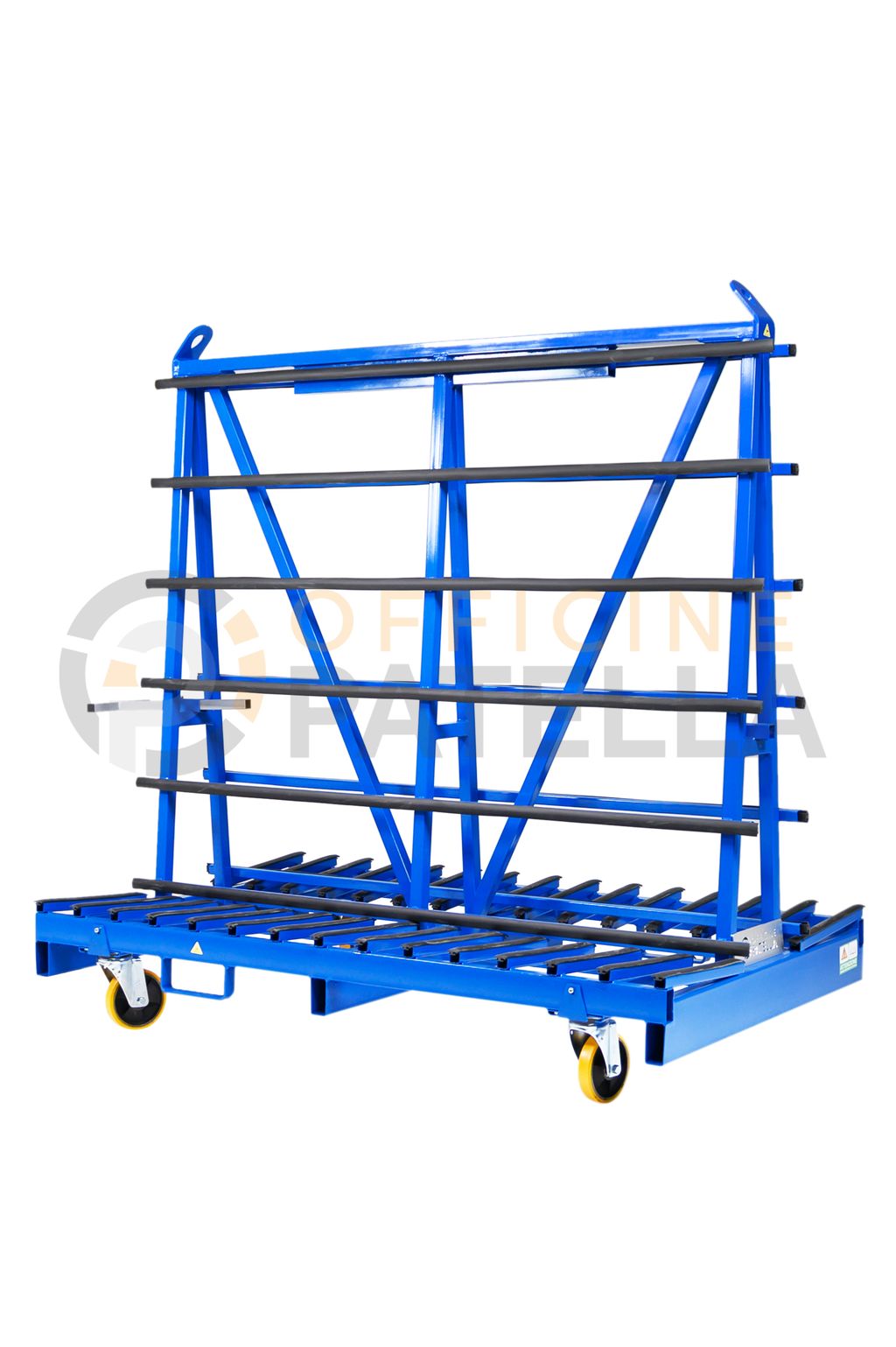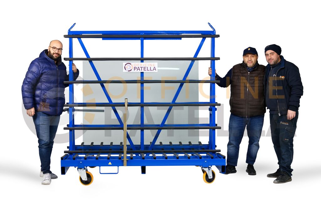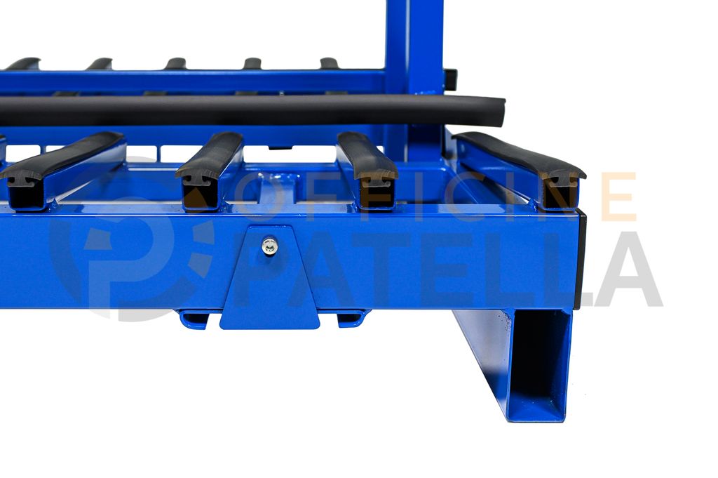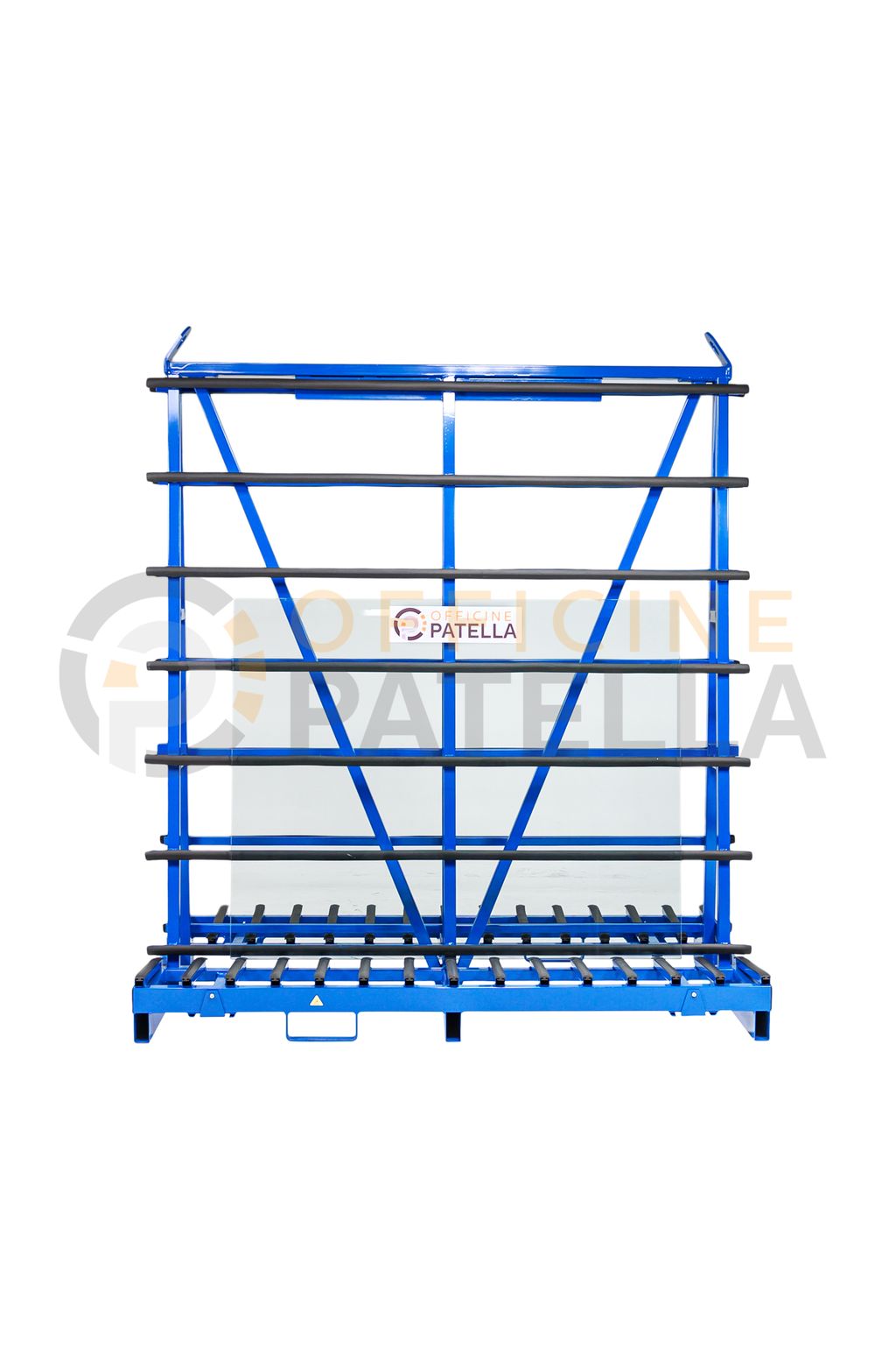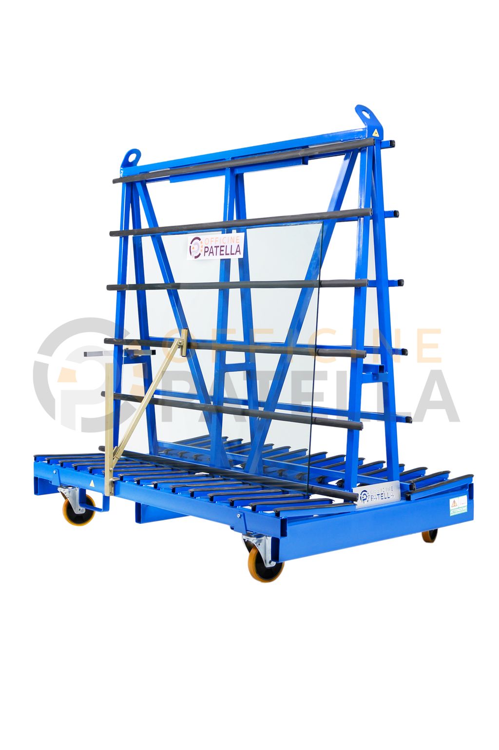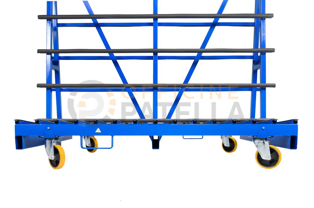 Cavalletto A3 Verniciato: articolo con doppia funzione, sia per trasporto e movimentazione di vetri tramite il carroponte oppure con carrello elevatore presso i cantieri, anche per la movimentazione interna , tramite il dispositivo per l’inserimento di ruote sfilabili.