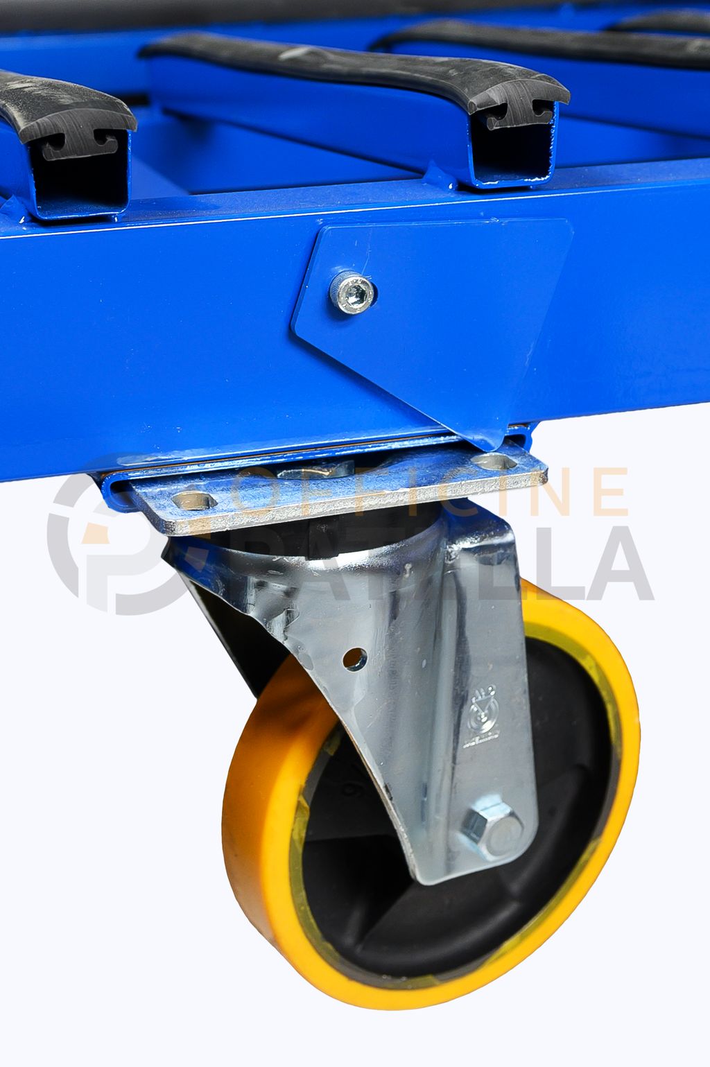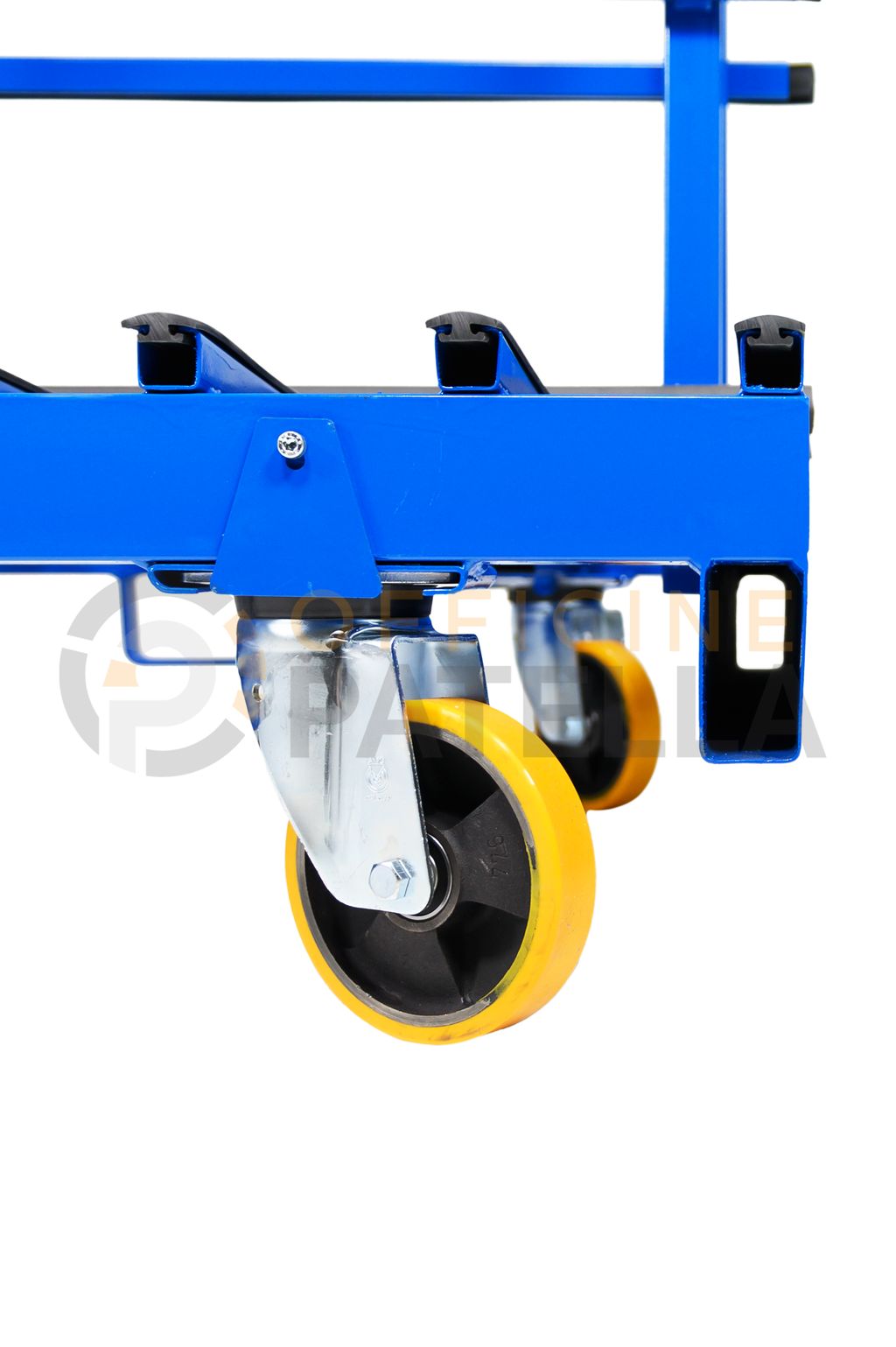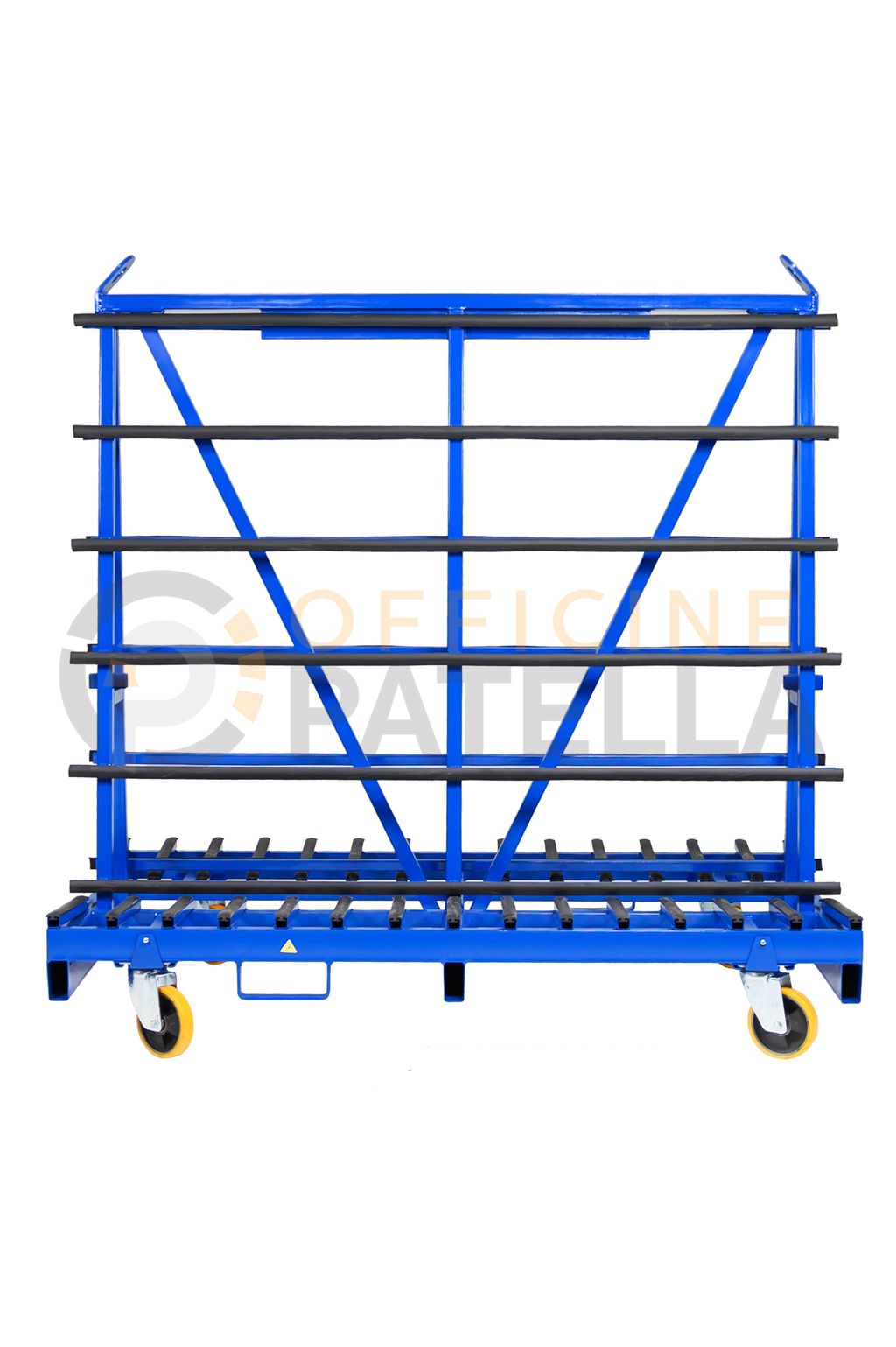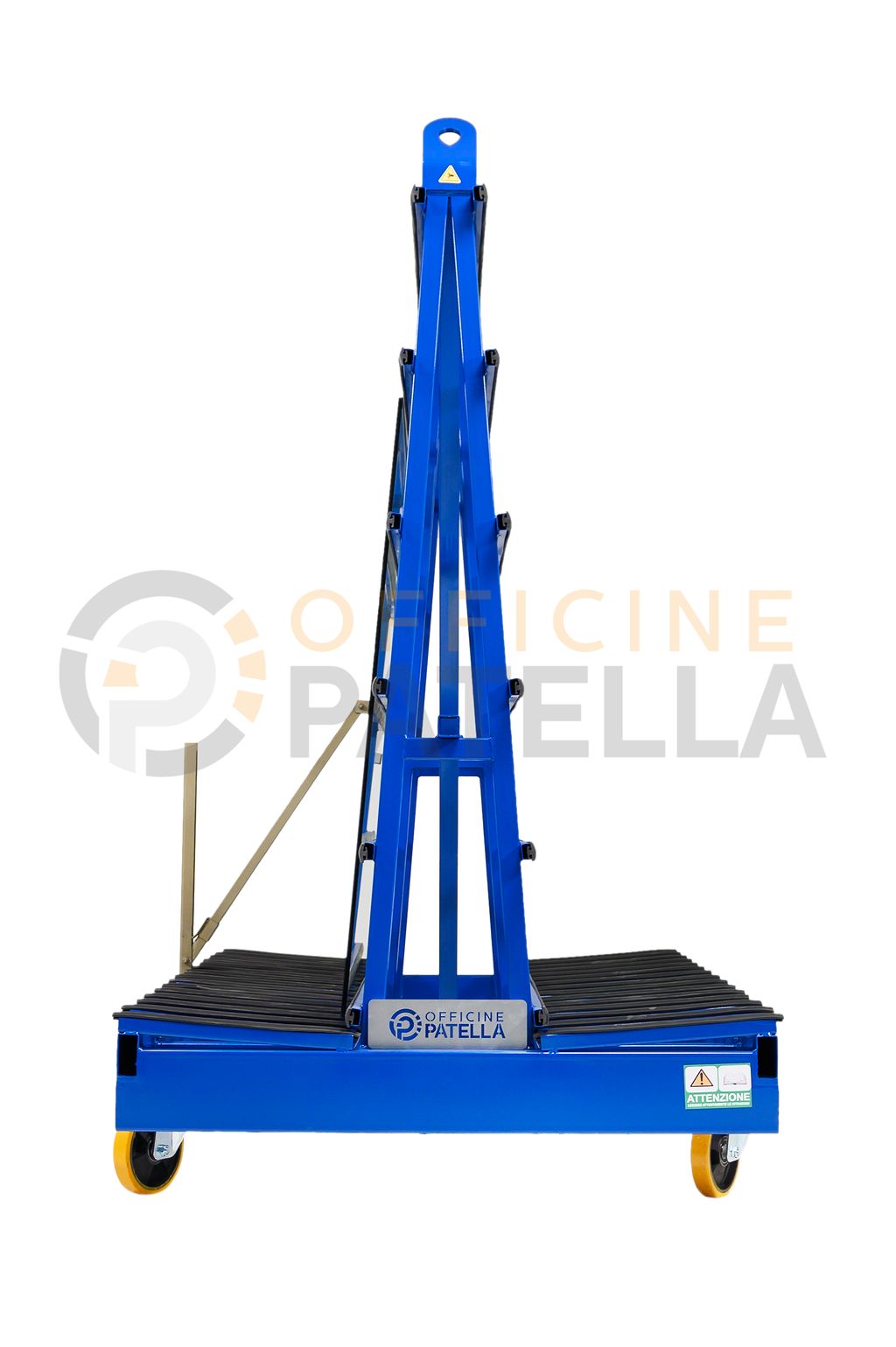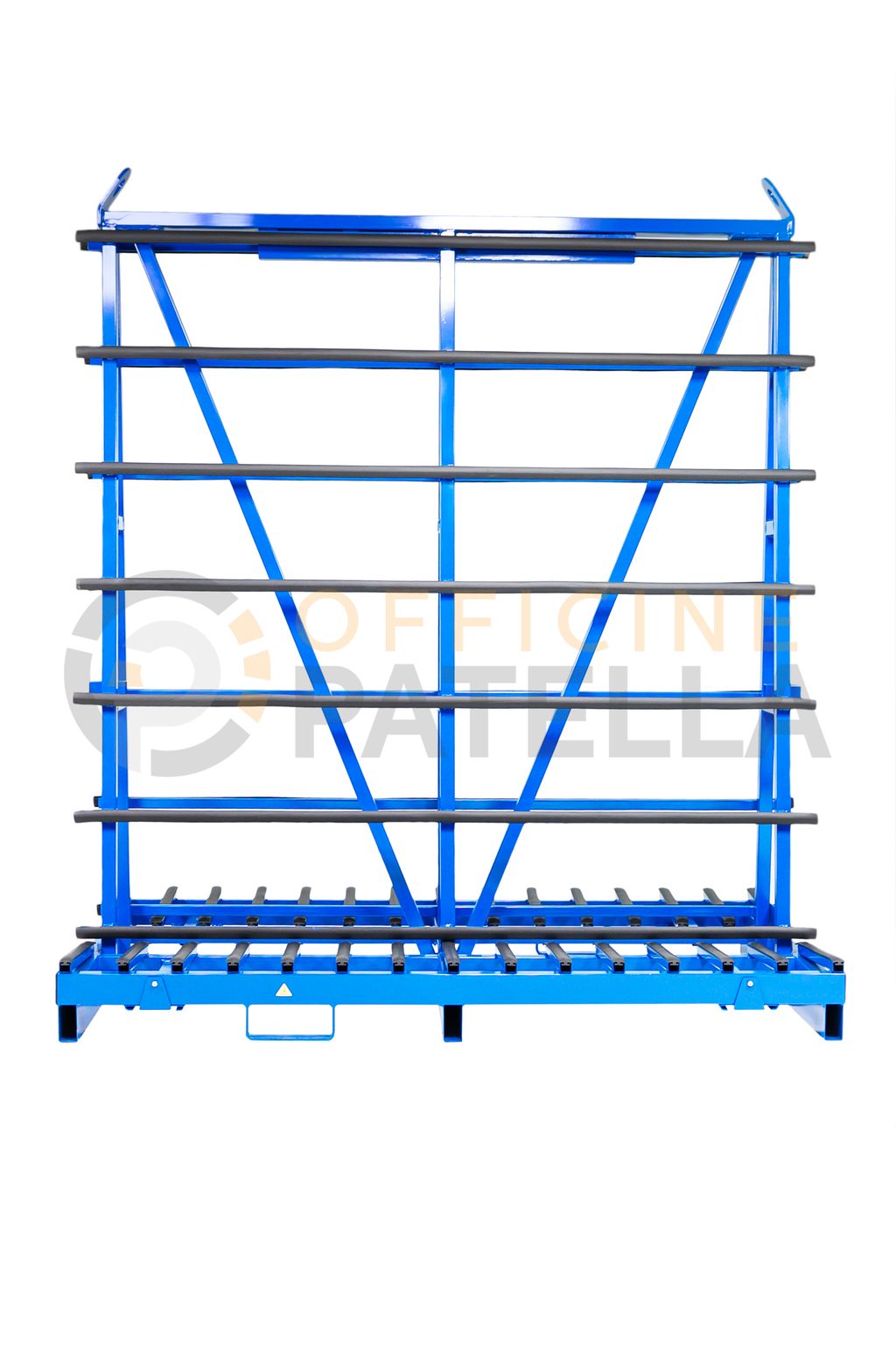 Cavalletto A3 Verniciato: articolo con doppia funzione, sia per trasporto e movimentazione di vetri tramite il carroponte oppure con carrello elevatore presso i cantieri, anche per la movimentazione interna , tramite il dispositivo per l’inserimento di ruote sfilabili.